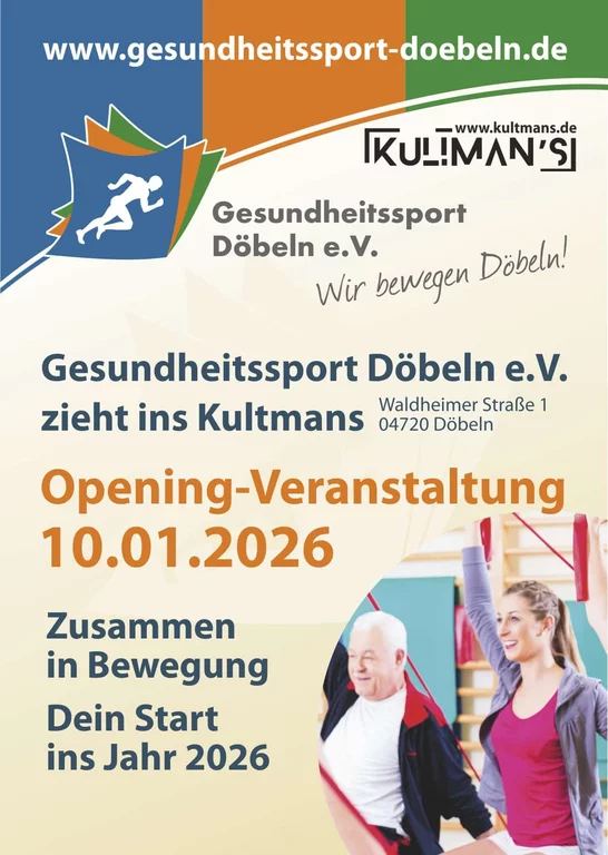 Wir freuen uns sehr, ab dem 10. Januar 2026 den Gesundheitssport Döbeln e.V. als neuen Partner und festen Bestandteil im Kultmans – Altes Stemke Werk in Döbeln begrüßen zu dürfen. Damit wird unser Haus um einen wichtigen Baustein reicher: Bewegung, Gesundheit und Prävention für alle Generationen.